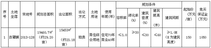 根據(jù)《中華人民共和國土地管理法》、《中華人民共和國城市房地產(chǎn)管理法》、國土資源部《招標(biāo)拍賣掛牌出讓國有建設(shè)用地使用權(quán)規(guī)定》等相關(guān)法律、法規(guī)規(guī)定, 經(jīng)古藺縣人民政府批準(zhǔn),受古藺縣國土資源局委托,古藺縣公共資源交易中心決定以拍賣方式出讓2013-128號地塊的國有建設(shè)用地使用權(quán)。現(xiàn)將有關(guān)事項公告如下: